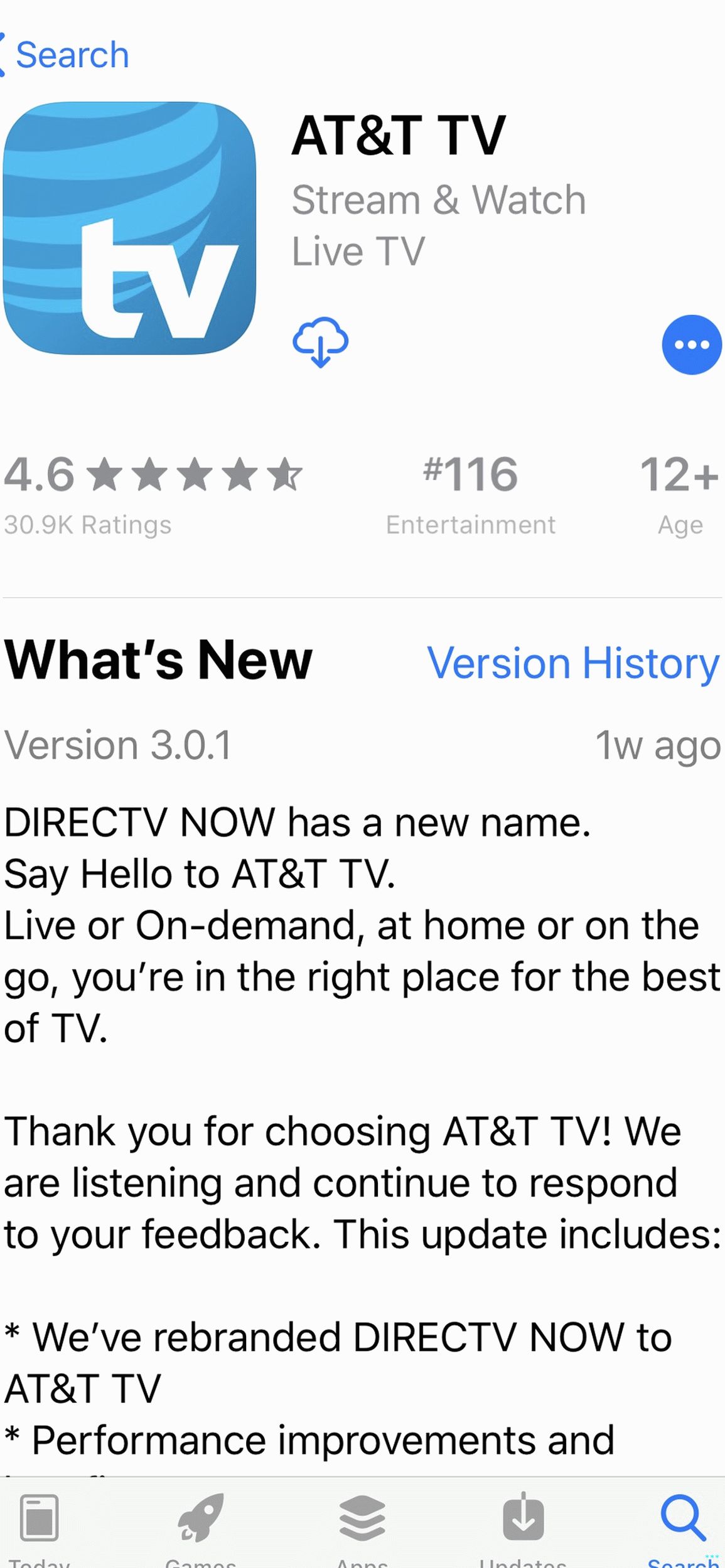 Release notes from the AT&T TV app page in Apple’s App Store.AT&T