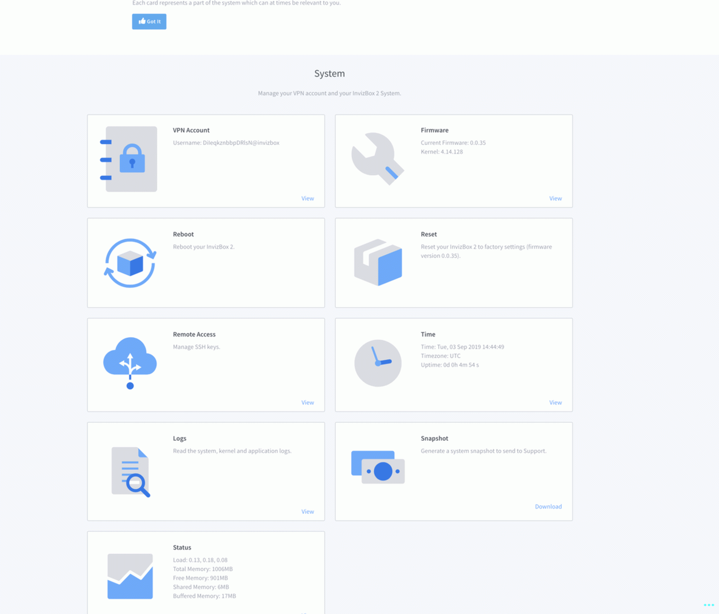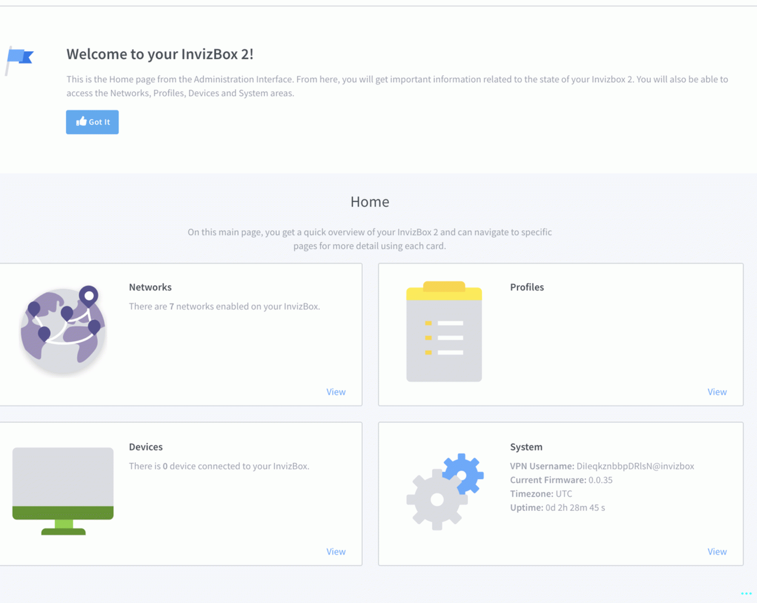 La home page dell’interfaccia amministrativa di InvizBox 2.
