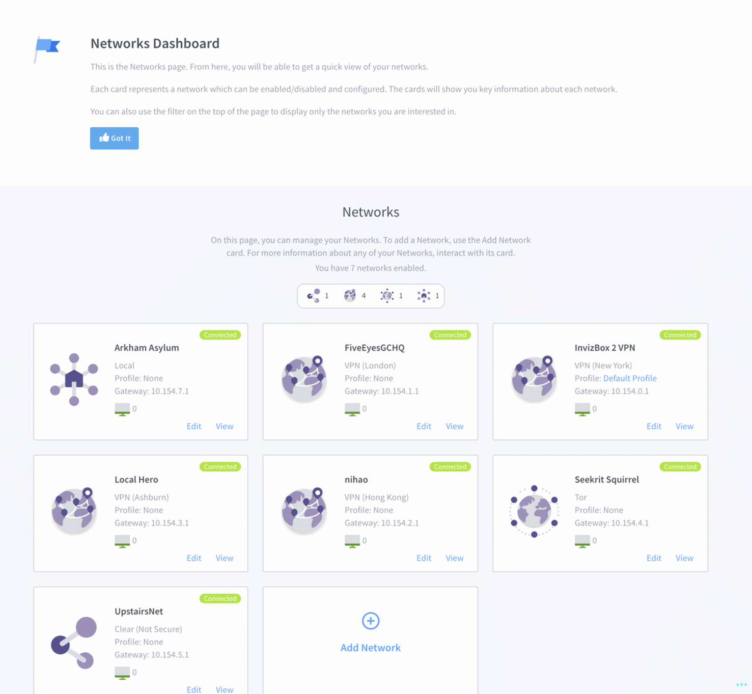 La configurazione di rete offre diverse opzioni in base a cosa tipo di connessione che utilizzerà: VPN, Tor, open o dead-ended.