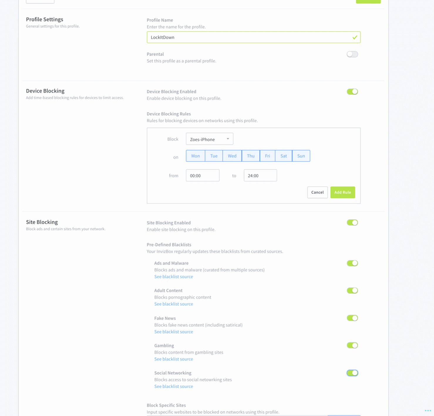 InvizBox 2 ha una serie di filtri e connessioni per i contenuti anche controlli. È possibile impostare il controllo genitori, nonché i blocchi per social network, siti di giochi d’azzardo, domini pubblicitari, noti domini malware e persino siti di notizie falsi basati su host open source liste nere e liste bianche.