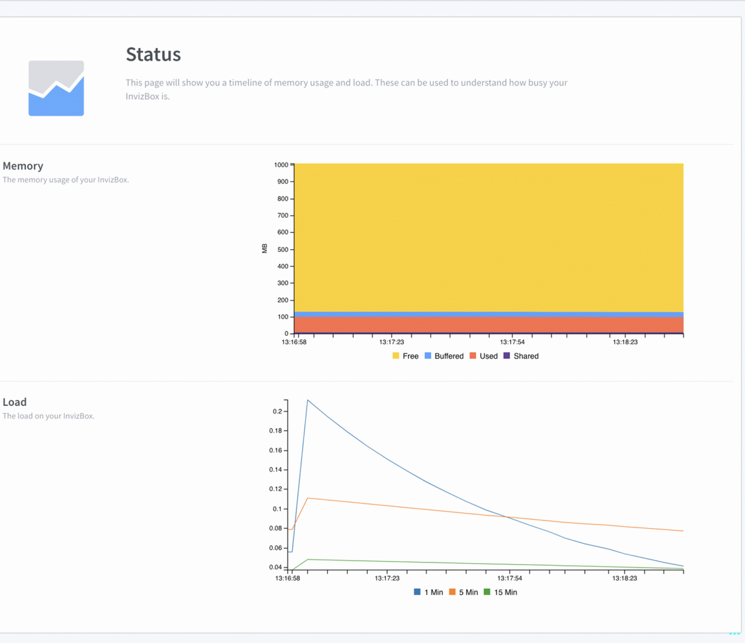 La pagina di stato mostra la memoria e il carico di elaborazione su InvizBox 2 router.